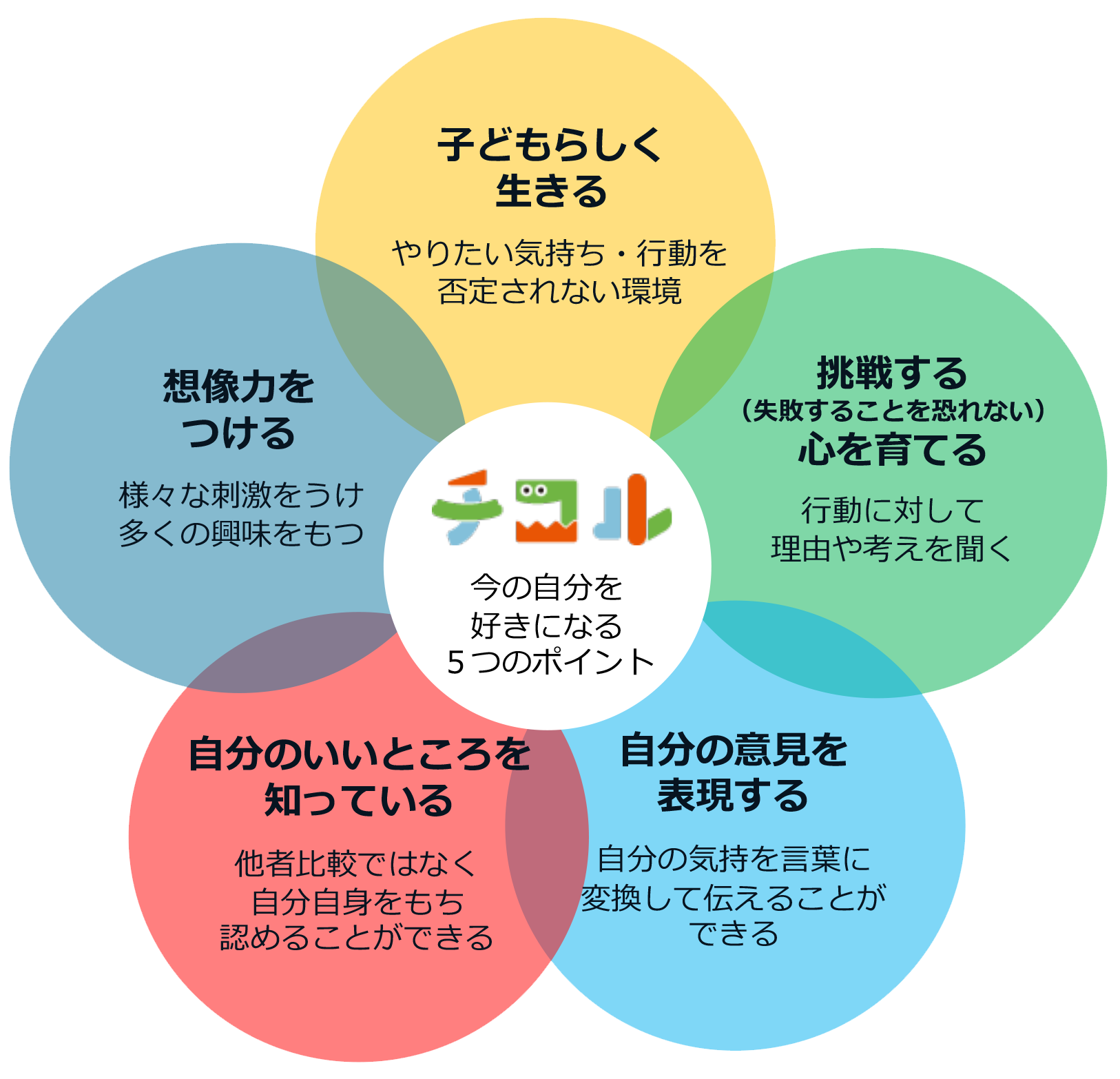 こうした考えをもとに、チコルアフタースクールでは、「今の⾃分を好きになる」5つのポイントを意識しながら⽇々の活動を⾏っていきます。