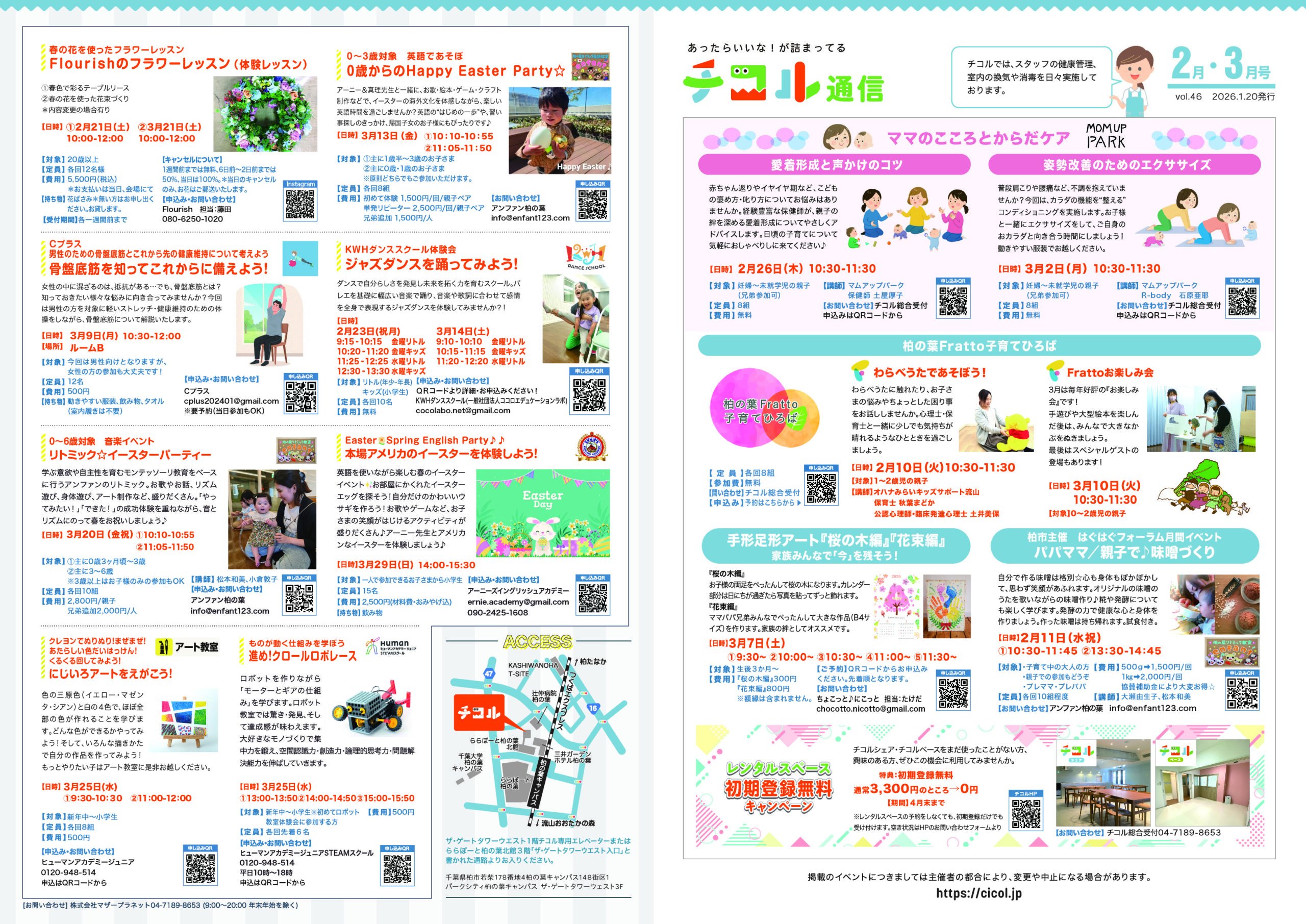 チコル通信2.3月号(vol.46)が発行されました🌟ママのこころとからだのケアイベント、お楽しみ会や親子でみそ作りのほか、英語で楽しむイースターイベントなどもありますよ🤗💕みなさまのご参加お待ちしております!